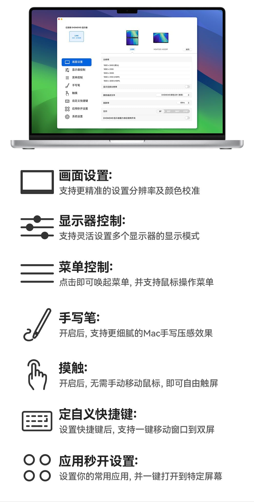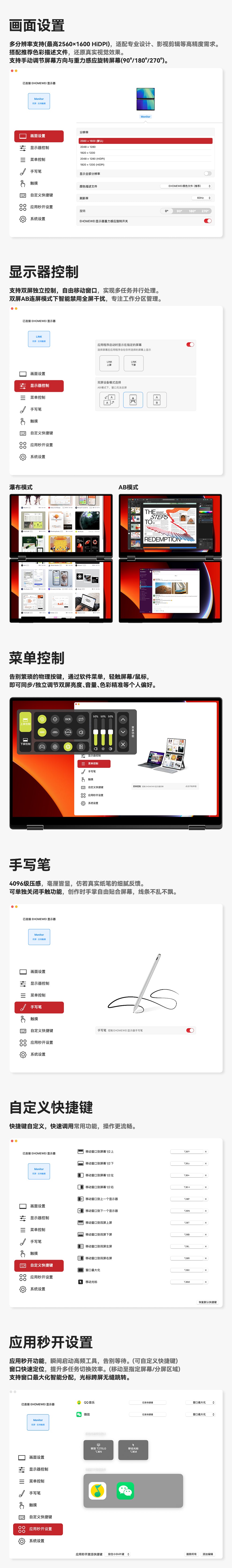 软件介绍:这是针对EHOMEWEI便携屏自研的屏幕控制软件(Window系统以及Mac OS系统都兼容),在这个软件里,你可以快速调节你的EHOMEWEI便携屏,可以用鼠标控制显示器菜单,可以解锁超精细的压感画笔设置,甚至可以自定义触控手势的效果,让你解锁便携屏的全新玩法。